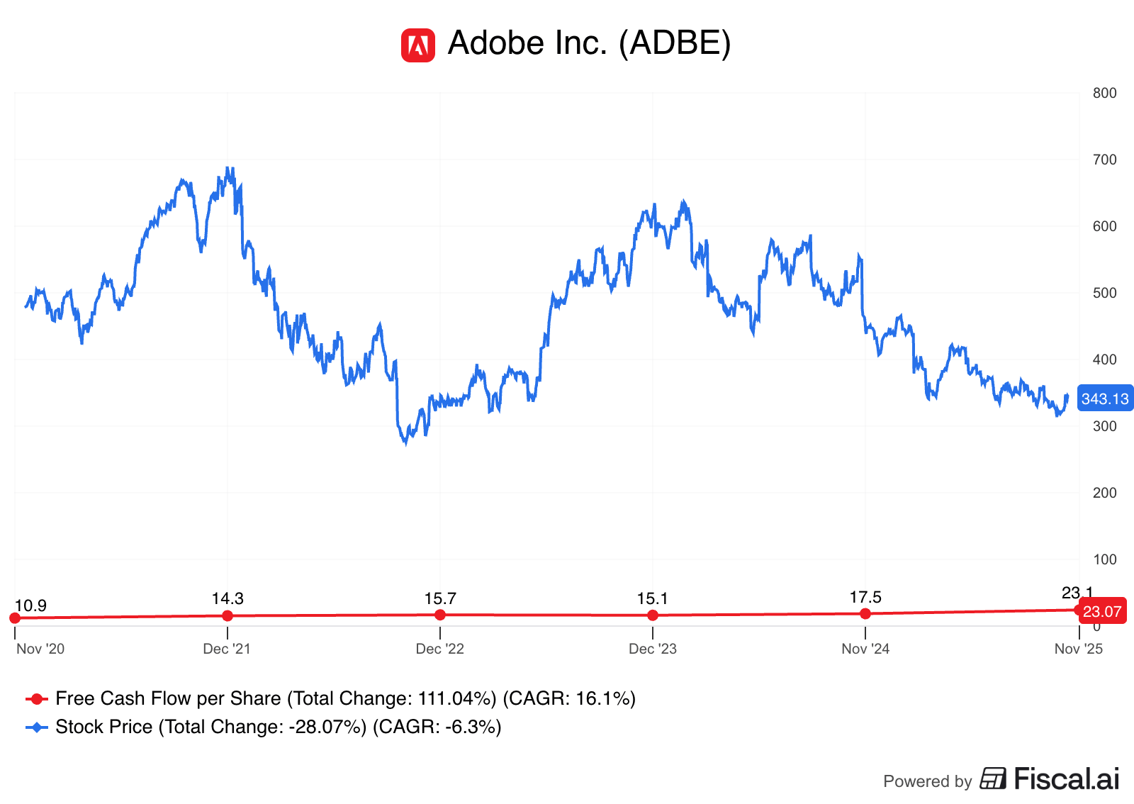 Es normal sentirse frustrado como inversor de Adobe. El Flujo de Caja Libre por acción de la compañía ha aumentado a una Tasa de Crecimiento Anual Compuesta (CAGR) del 16% desde 2021, pero la acción ha caído un 6% durante el mismo período de tiempo: