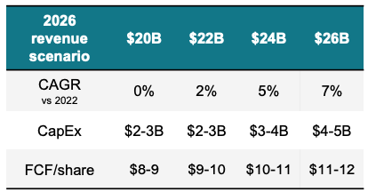 No tengo absolutamente ninguna visibilidad sobre lo segundo, así que asumamos solo el 35% de ITC. Un ITC del 35% resulta en un capex neto (punto medio) de $1.600 millones antes de cualquier subvención. El Flujo de Caja Operativo en 2025 fue de $7.150 millones. Asumamos que esto crece un 10%-12% en 2026 (ignorando cualquier viento de cola del capital circulante y de márgenes, solo teniendo en cuenta el crecimiento de ingresos), lo que resulta en un Flujo de Caja Operativo de alrededor de $8.000 millones. Ambas cosas resultan en un Flujo de Caja Libre de $6.400 millones. Esto significa que, tras crecer un 94% en 2025, podríamos esperar que el FCF aumente quizás a triple dígito en 2026 (de nuevo, asumiendo que no se reciban subvenciones). Esto resultaría en alrededor de $7 de FCF por acción diluida en 2026, lo que está por debajo del punto bajo que compartió el equipo directivo en el capital management update de 2025: