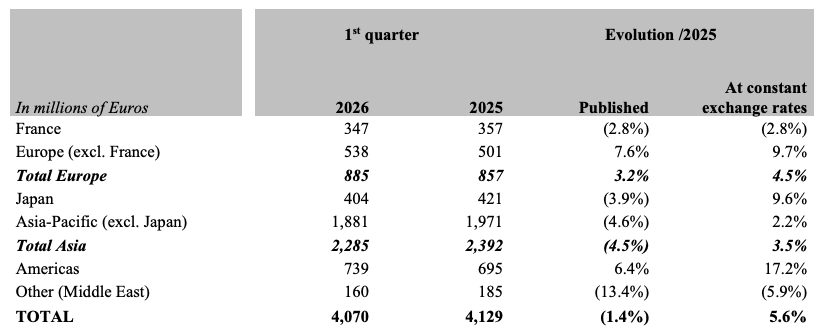 El crecimiento de las ventas de las tiendas propias fue del 7%, pero las ventas en las tiendas en concesión (aeropuertos/Oriente Medio) cayeron un 7%. Esto nos indica que el conflicto en Irán ha afectado principalmente a la región de Oriente Medio y a los ingresos de turistas. Francia se vio particularmente afectada por el conflicto porque las ventas a tiendas en concesión y aeropuertos suelen ser incluidas en esta geografía. Las ventas en Francia habrían caído "solo" un 1% si ignoramos estas ventas