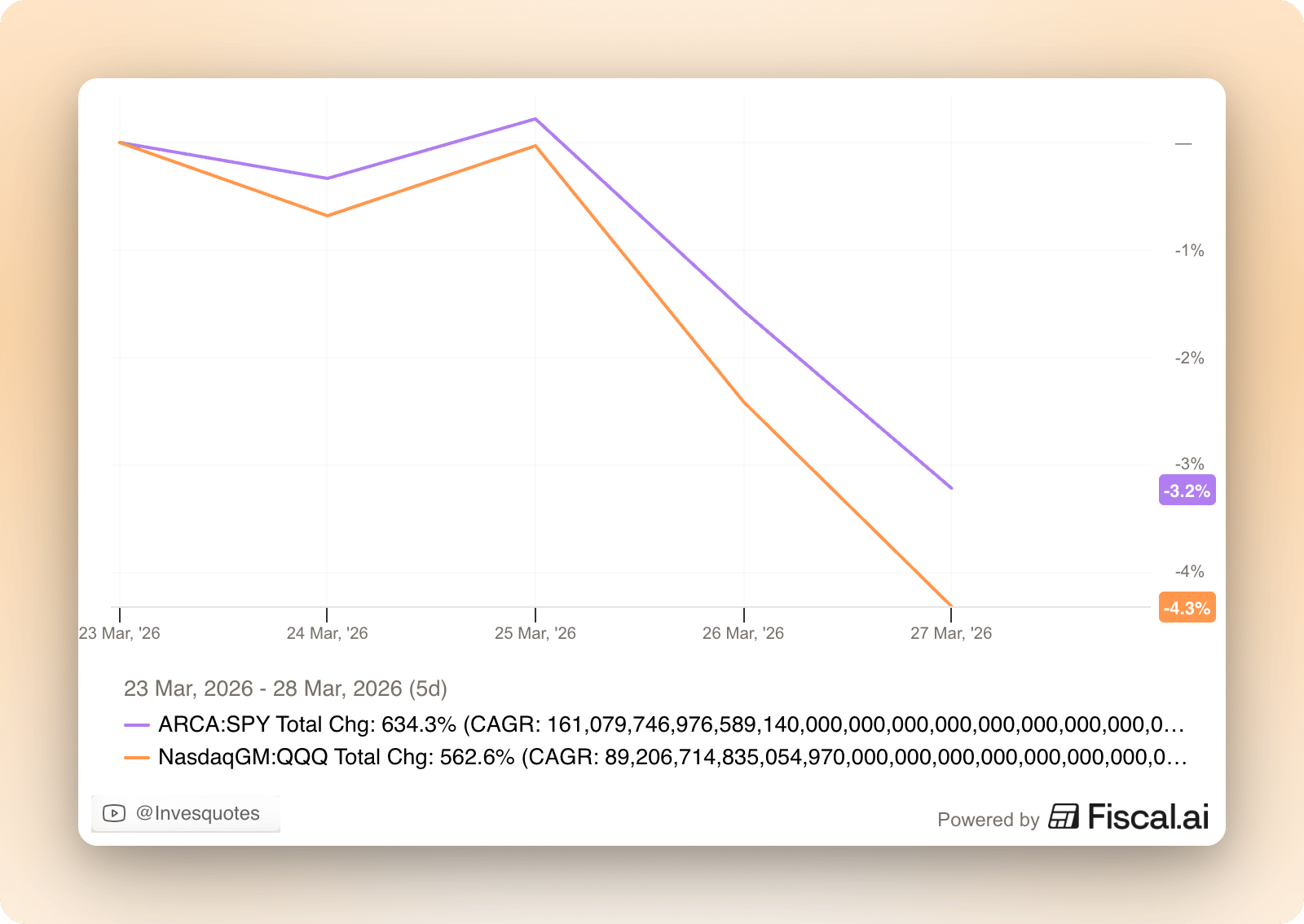 El conflicto en Irán siguió pesando en los mercados financieros a pesar del continuo flujo de noticias sobre un "inminente" alto el fuego (parece que el TACO también tiene sus límites al fin y al cabo). Ambos índices cayeron más del 3% esta semana: