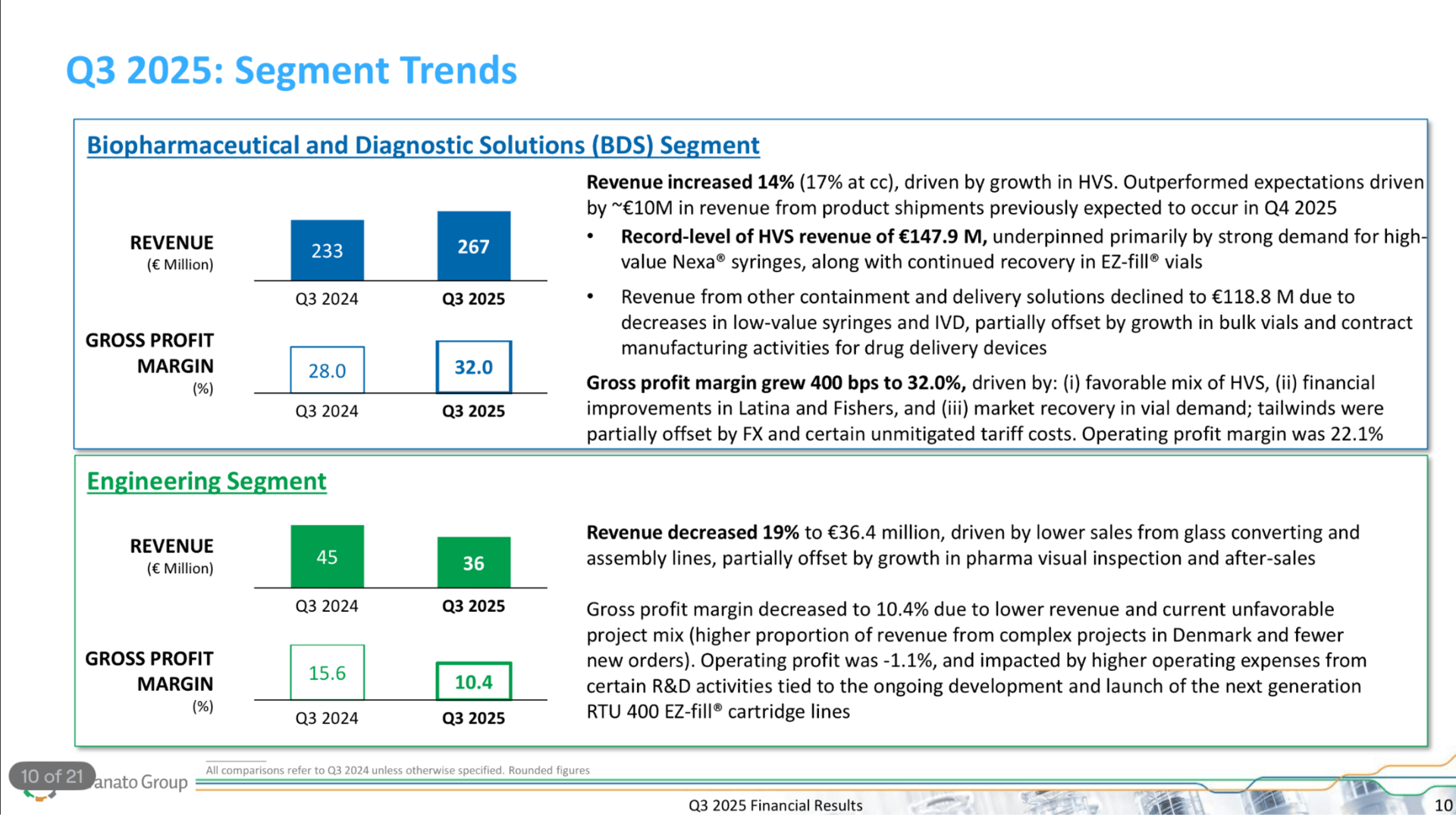 Stevanato ha presentado hoy resultados muy buenos de su tercer trimestre, aunque requieren de un poco de contexto. La compañía está experimentando focos de fortaleza significativa, compensados por cierta debilidad en el segmento de engineering y un entorno de tipos de cambio desfavorable (fuera del control del equipo directivo). Esto, en mi opinión, no está permitiendo que la historia brille como debería, y es probable que sea una de las razones por las que la acción está cayendo a pesar de los sólidos resultados: