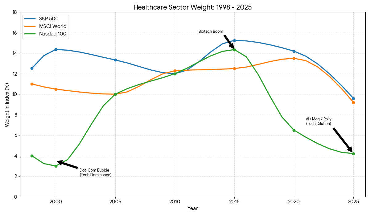 En segundo lugar, no quiero dar a entender que todo en el sector de healthcare sea atractivo; hay literalmente compañías que nunca tocaría ni con un palo. Dicho esto, es interesante ver que la industria de healthcare está subrepresentada en los índices, dada su creciente relevancia a medida que la población envejece. En caso de que te interese, aquí tienes cómo ha evolucionado el peso de la industria de healthcare a lo largo del tiempo en los principales índices: