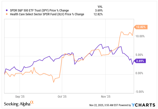 El día siguiente también fue uno interesante. Los índices repuntaron de manera significativa, pero Nvidia y muchas acciones de IA no lo hicieron (es decir, ¿primeros signos de una rotación?). Independientemente de si crees que este es el comienzo de una rotación o no, lo que sucedió esta semana es interesante (aunque es poco probable que cambie algo a largo plazo). He estado diciendo durante bastante tiempo que si el trade de la IA alguna vez flaquea (aún es demasiado pronto para saberlo), podríamos ver como se recuperan algunos sectores castigados. La industria de healthcare es un buen ejemplo aquí. Echa un vistazo a lo que ha hecho el XLV (el ETF de healthcare) frente al S&P durante los últimos 3 meses de cierta inestabilidad: