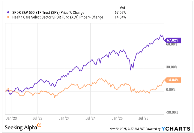 El sector de healthcare sufrió durante el boom & bust de la pandemia y ha tenido un rendimiento terrible en comparación con los índices principales. Solo por dar un poco de contexto, el XLV estuvo prácticamente plano durante tres años (antes de la reciente subida) con el S&P 500 subiendo más del 60%: