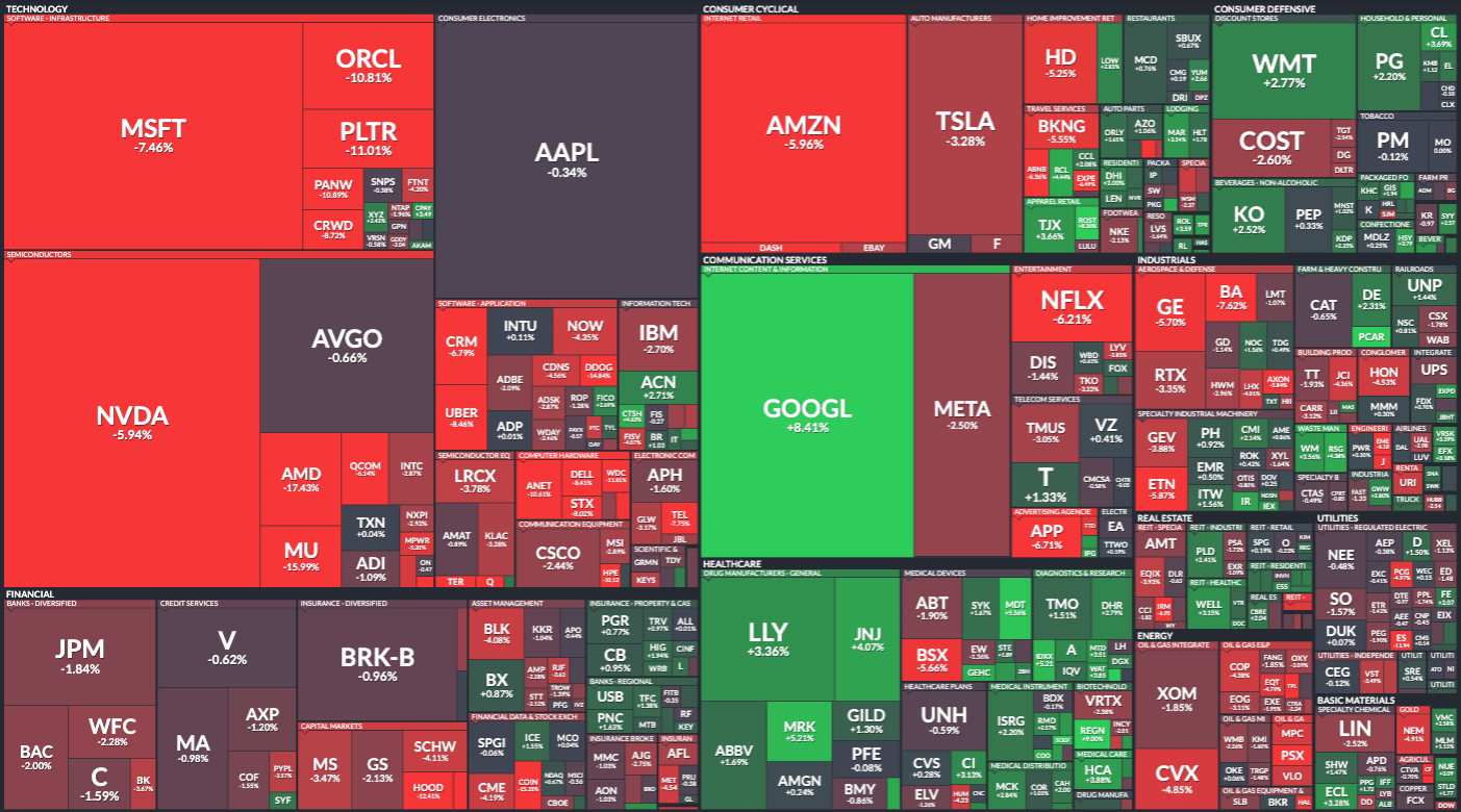 El mapa por industrias retrató lo que he comentado arriba: el dinero fluyendo desde la IA hacia sectores más defensivos. Veremos si este es el comienzo de una nueva tendencia o solo un bache en el camino (honestamente, ni idea):