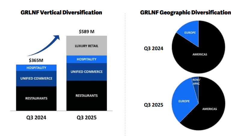 En segundo lugar, aunque muchos ven a Shift4 como un negocio principalmente expuesto a los restaurantes, la compañía está ahora mucho más diversificada y menos de la mitad del GRLNF está actualmente vinculada a la industria de restaurantes. La diversificación geográfica también ha mejorado bastante después de la adquisición de Global Blue: