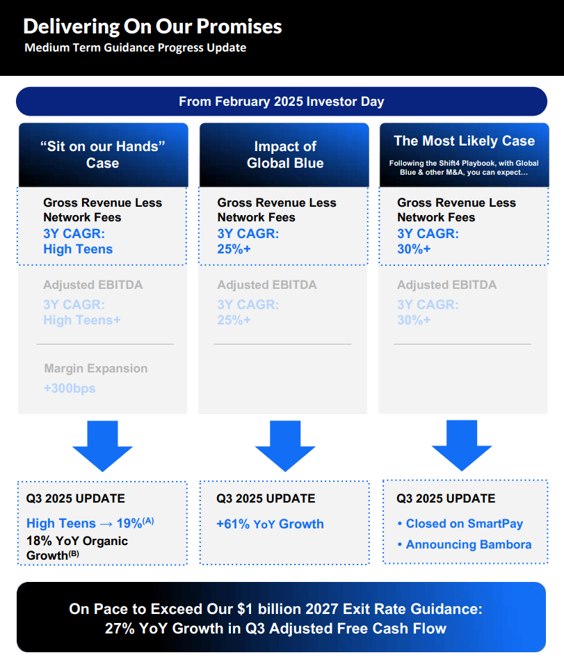El tercer trimestre de 2025 fue el primer trimestre que incluyó la adquisición "transformacional" de Global Blue (se cerró en julio). Aunque esto hace que los números reportados sean algo engañosos, el equipo directivo decidió darle al mercado lo que quería y también reportó su crecimiento orgánico. Esto, junto con algunos cambios en la estructura accionarial y organizacional de la compañía, está comenzando a dar paso a una historia menos compleja.