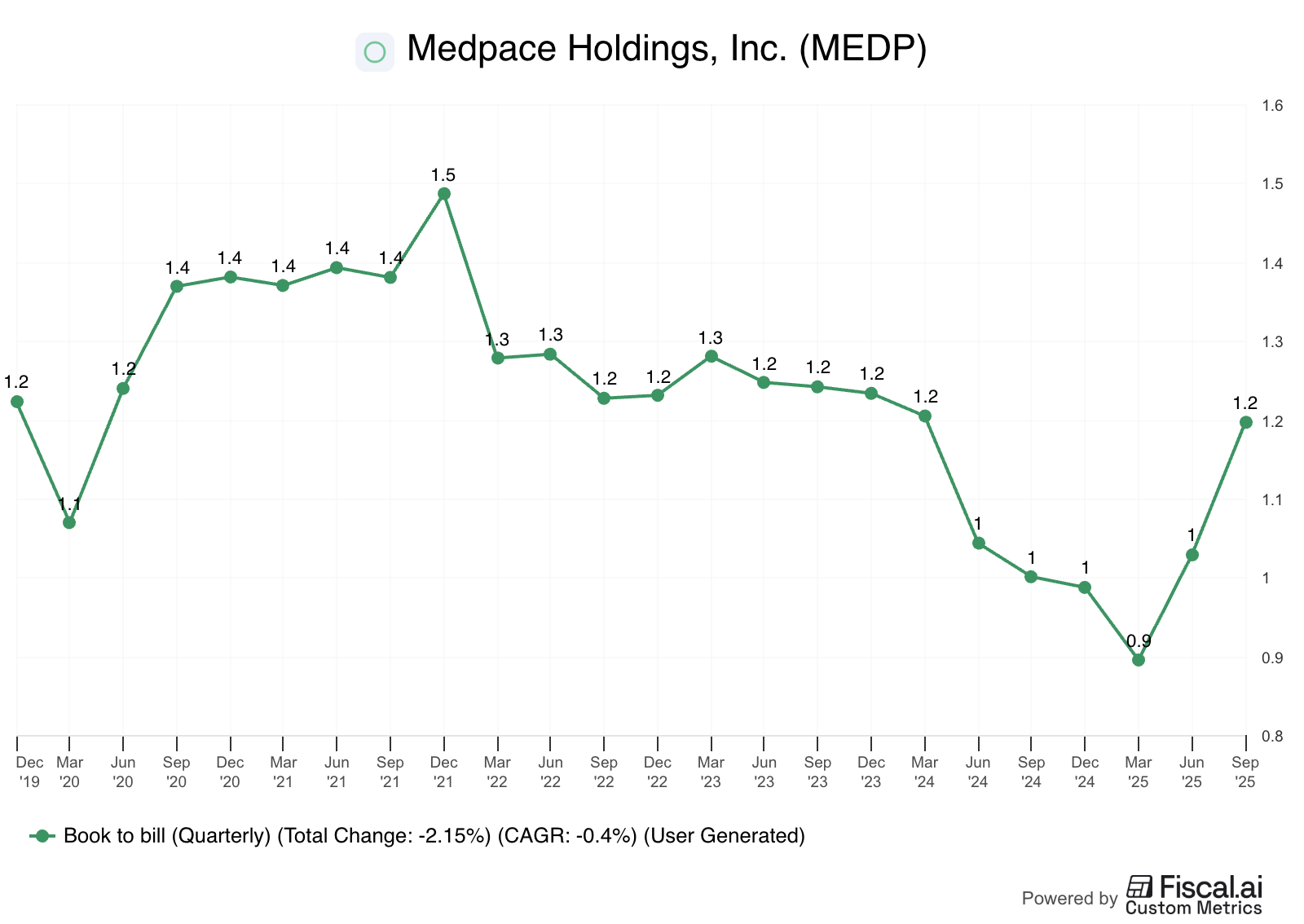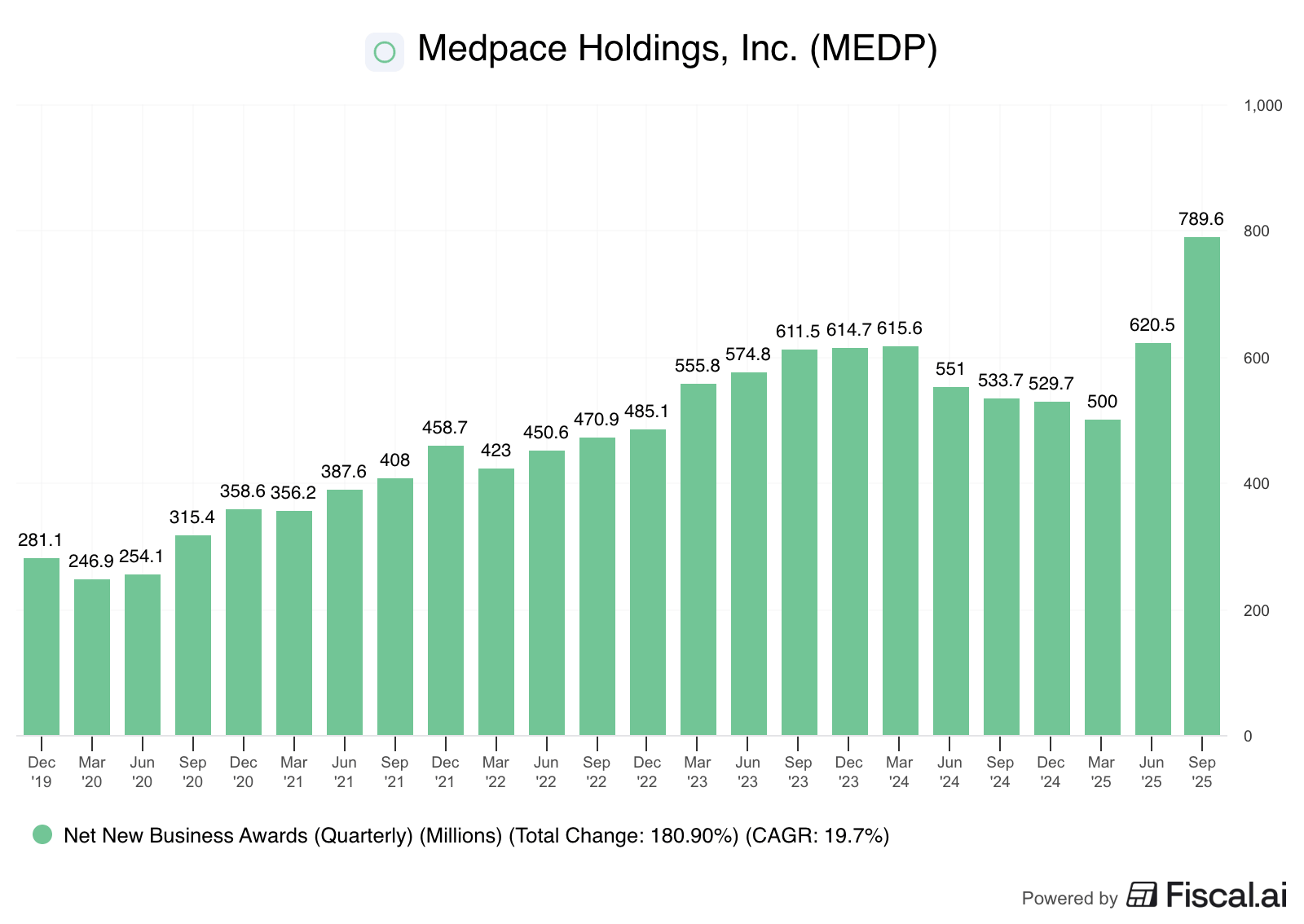 Por lo que veo, las expectativas del mercado apuntaban a un crecimiento del 16,8% en 2025 (que probablemente será mayor) y del 8,2% en 2026 (que también con alta probabilidad será mayor). Esto significa que, a pesar de las expectativas de desaceleración, Medpace sigue batiendo las estimaciones de los analistas.