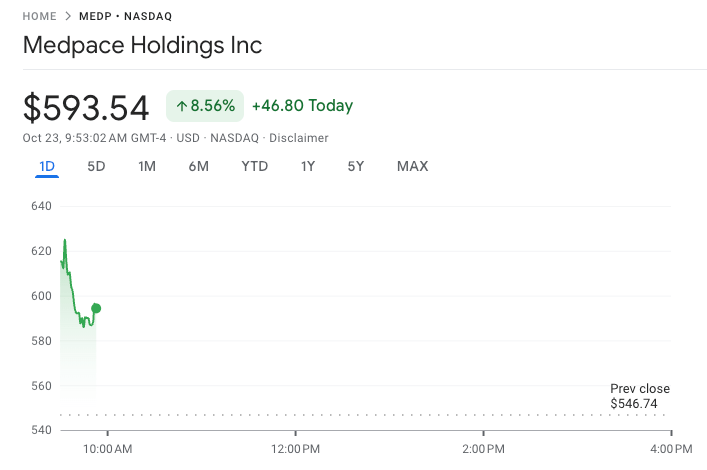 La de ayer fue la segunda presentación de resultados de Medpace desde que soy accionista, y nuevamente la compañía la sacó del estadio. La acción inicialmente subía un 20% tras el cierre, pero terminó normalizándose después de la call de resultados: