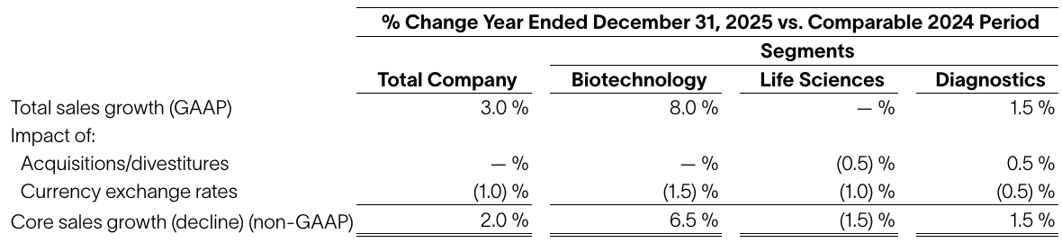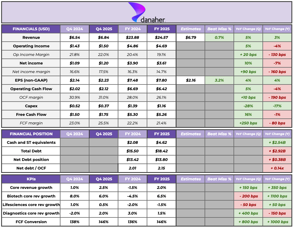 Este no va a ser un artículo extenso porque me voy a centrar casi exclusivamente en un tema: el guidance de 2026 y cómo contextualizarlo. 2025 fue un año decente (aunque para nada excepcional) para Danaher. La compañía experimentó una estabilización y mejora gradual en la mayoría de sus mercados finales (principalmente biotecnología), pero se enfrentó a un entorno bastante complejo y volátil que le llevó a incumplir su guidance. En el Q4 de 2024, el equipo directivo estableció un guidance para 2025 de crecimiento core de ingresos del 3%, pero la empresa acabó el año con un crecimiento core del 2%. Siendo justos, la empresa se enfrentó a varios vientos en contra significativos (y algunos de ellos totalmente impredecibles):