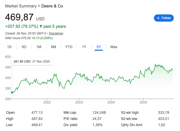 Deere presentó resultados del Q4 y de su Año Fiscal 2025 el miércoles (antes de la apertura del mercado). Los resultados fueron “meh” y los comentarios sobre el próximo año fiscal tampoco fueron muy alentadores. Al mercado no le gustaron los resultados, y la acción cayó casi un 6%. Antes de presentar resultados, la acción de Deere cotizaba cerca de máximos históricos, por lo que apenas se encuentra a un 10% de dichos máximos a pesar de la caída post-resultados: