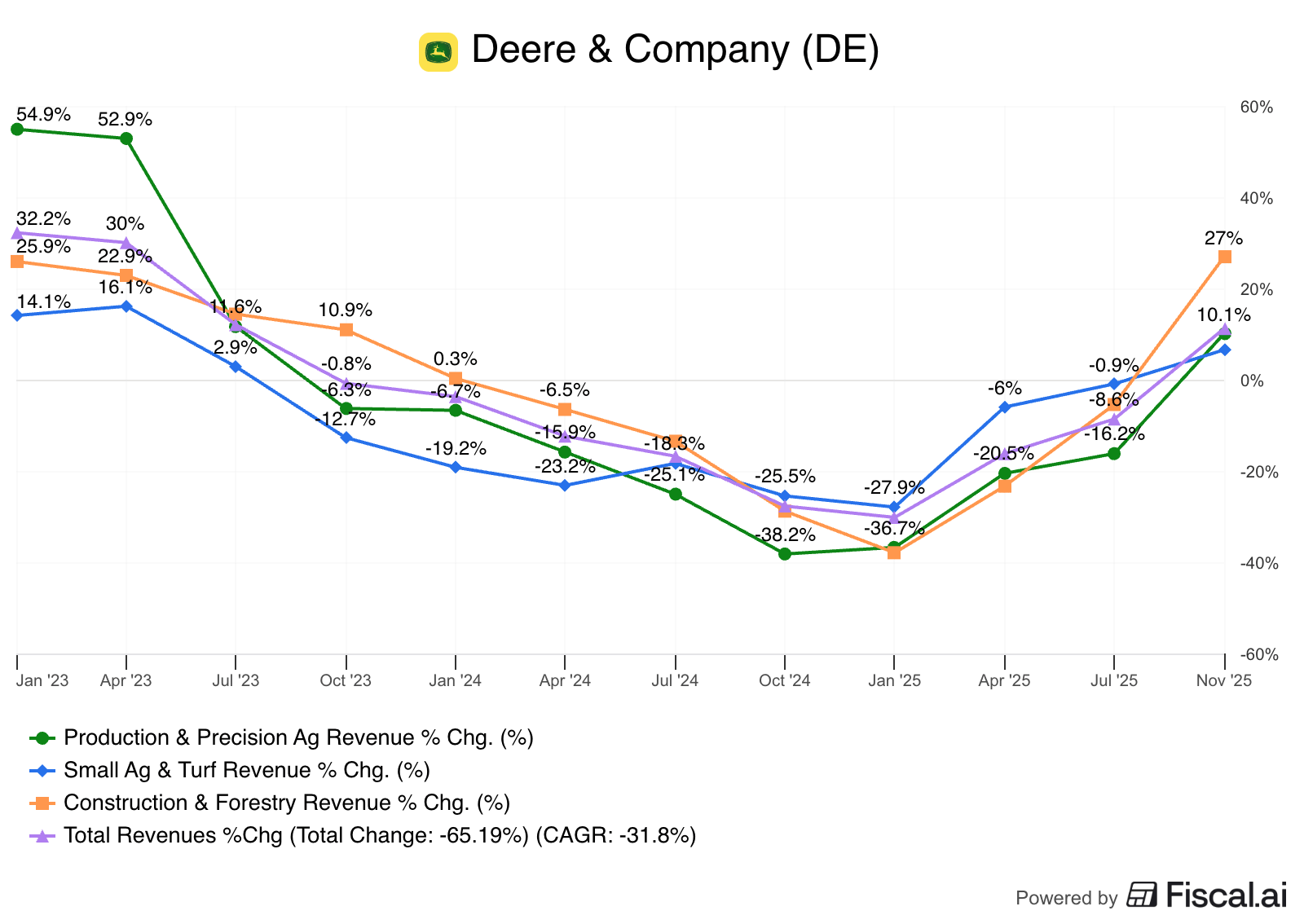 Dos cosas parecen claras en esta tabla. La primera es que el crecimiento sigue mejorando/normalizándose. Todos los segmentos de Deere mostraron una trayectoria ascendente, y el Q4 fue el primer trimestre desde el Q3 de 2023 en el que la compañía aumentó sus ventas.