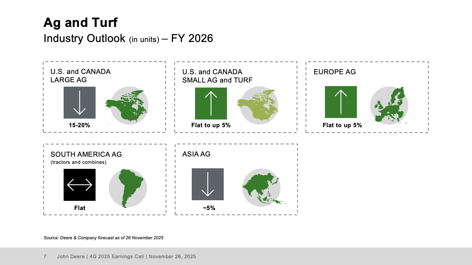 Aunque los números anteriores podrían sugerir que 2025 fue el punto bajo del ciclo, el equipo directivo opina que la Gran Agricultura de Norteamérica verá su punto más bajo en 2026 tras otra disminución del 20%: